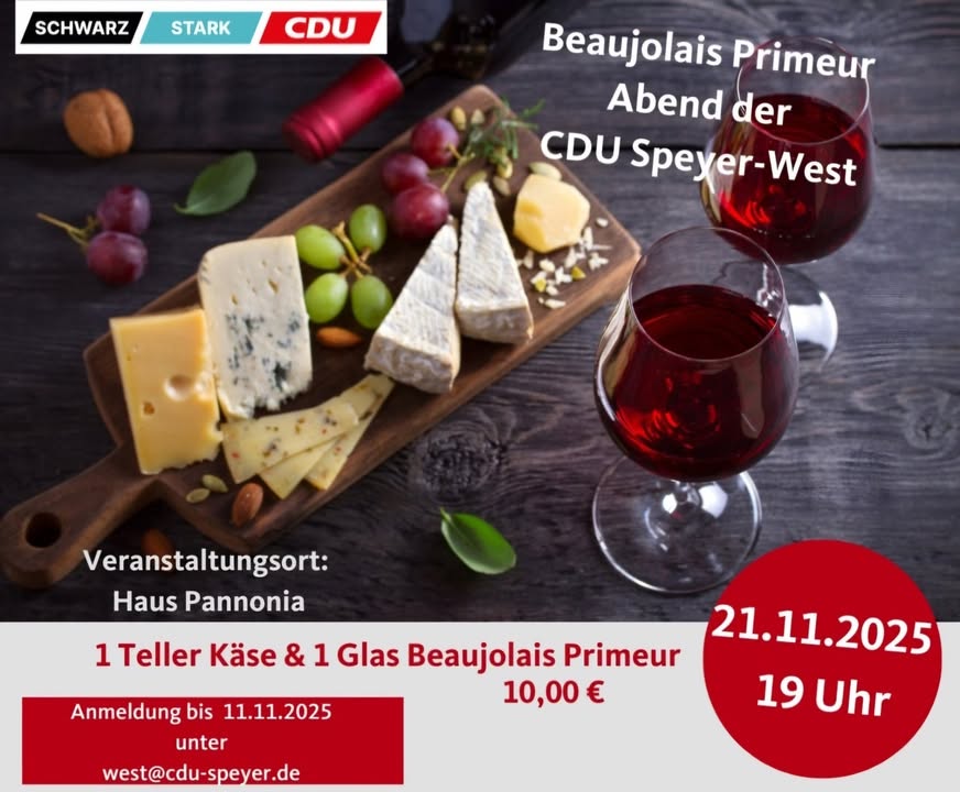 Traditioneller Beaujolais-Primeur-Abend am 21.11. 🍷 bei der CDU Speyer-West. Jetzt anmelden und den Abend mit guten Gesprächen bei Wein und Käse genießen! Anmeldung an: 👉 west(at)cdu-speyer.de