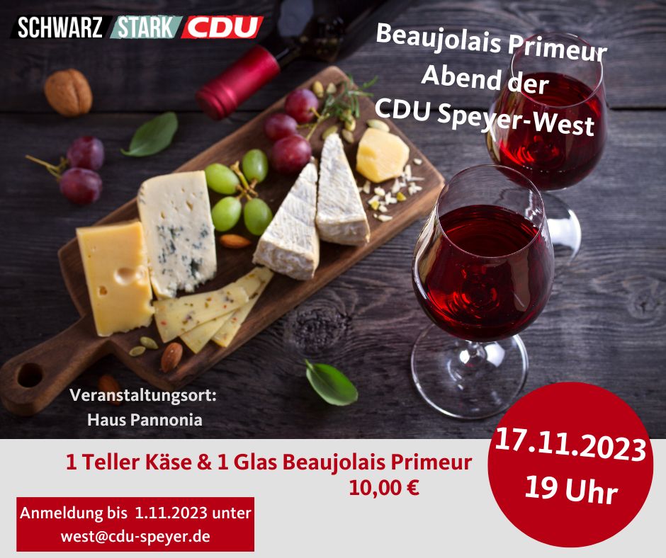 Der Kostenbeitrag für einen Teller Käse sowie ein Glas Beaujolais Primeur beträgt 10,00 Euro. Um Anmeldung wird unter west@cdu-speyer.de bis zum 1. November gebeten.